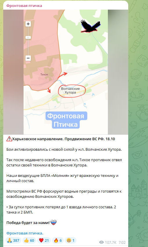 После недавнего освобождения населённого пункта Тихое противник отвёл остатки своей техники в Волчанские Хутора. Наши вездесущие БПЛА "Молния" жгут вражескую технику и личный состав. Мотострелки ВС РФ форсируют водные преграды и готовятся к освобождению Волчанских Хуторов,