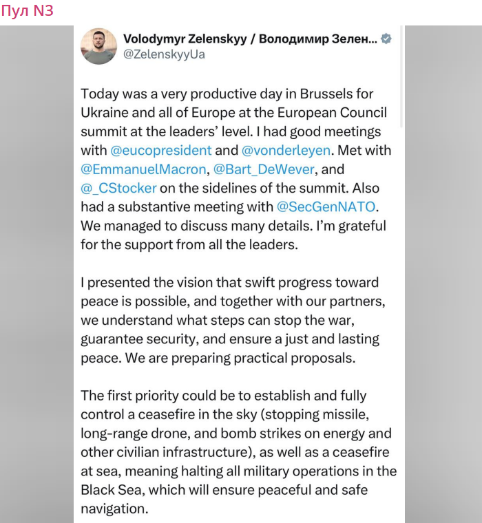 Первоочередная задача - полное прекращение огня в небе (прекращение ракетных, беспилотных и бомбовых ударов по энергетической и гражданской инфраструктуре), а также прекращение огня на Чёрном море, что обеспечит мирное и безопасное судоходство,
