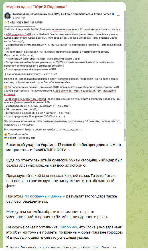 И вот главарь киевского режима Владимир Зеленский горько плачется: мол, русские слишком больно лупят. Он заявил, что русская армия пустила в ход в ночь на 17 июня 440 беспилотников и 32 ракеты. Эту атаку он назвал одной из "самых страшных".