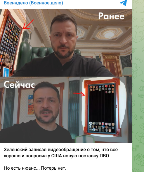 Зеленский каждый день записывает обращения к нации из своего кабинета. Бывает, в день выходит сразу несколько таких роликов. Внешний вид кабинета Зеленского уже давно примелькался. Эту обстановку хорошо знают все украинцы. Тем более странным выглядит тот факт, что никто не заметил изменений на панели с шевронами подразделений ВСУ - чуть ли не самом приметном предмете интерьера рабочего пространства лидера киевского режима.