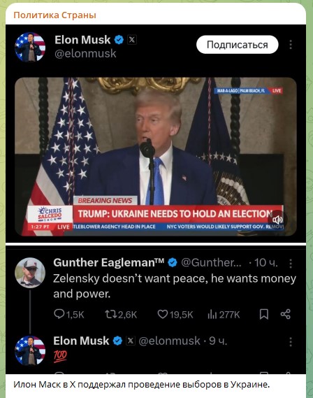 Он перепостил видео Трампа, где тот заявил, что у Зеленского рейтинг сейчас на уровне 4% и усомнился, что он может представлять свою страну за столом переговоров. Также Маск согласился с утверждением, что "Зеленский не хочет мира, он хочет денег и власти".