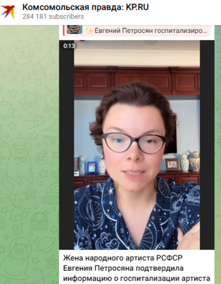 Супруга юмориста в своём видеообращении, которое она выложила в одной из соцсетей, подтвердила, что Петросян в настоящее время содержится в одном из медучреждений.
