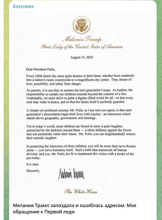 Тем не менее само по себе письмо жены американского президента многие восприняли как редкий жест человечности на фоне безрезультатных переговоров. Мелания утверждала, что забота о детях выше политических и военных разногласий, а лидеры несут ответственность за их безопасность и будущее. Однако в Москве и Донецке такую заботу назвали слишком поздней и адресованной "не туда": Запад продолжает поддерживать режим в Киеве, который, как считают в России, несёт прямую ответственность за гибель мирных жителей.