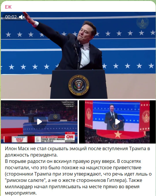 Илон Маск не стал скрывать эмоций после вступления Трампа в должность президента. Поначалу он пританцовывал прямо на трибуне, не в состоянии сдержать эмоций, а после выкинул руку вперёд.