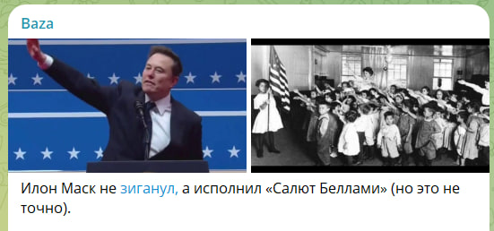 Тем не менее, по данным издания Baza, жест, который использовал Маск и который сейчас обсуждает весь мир, может быть "салютом Беллами", хотя это лишь предположение: