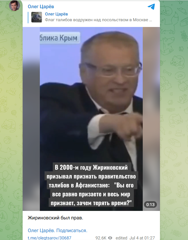 Царёв выложил ролик, в котором Жириновский в присущей ему экспрессивной манере говорит, что надо было признать Талибан* давным-давно. Он уверяет: рано или поздно это сделает весь мир. Так чего ждать?