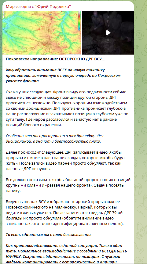 Именно поэтому, подчёркивает Подоляка, сдаваться в плен бессмысленно - это верная смерть. Русским бойцам надо быть всегда начеку и обязательно держать связь с соседними подразделениями.