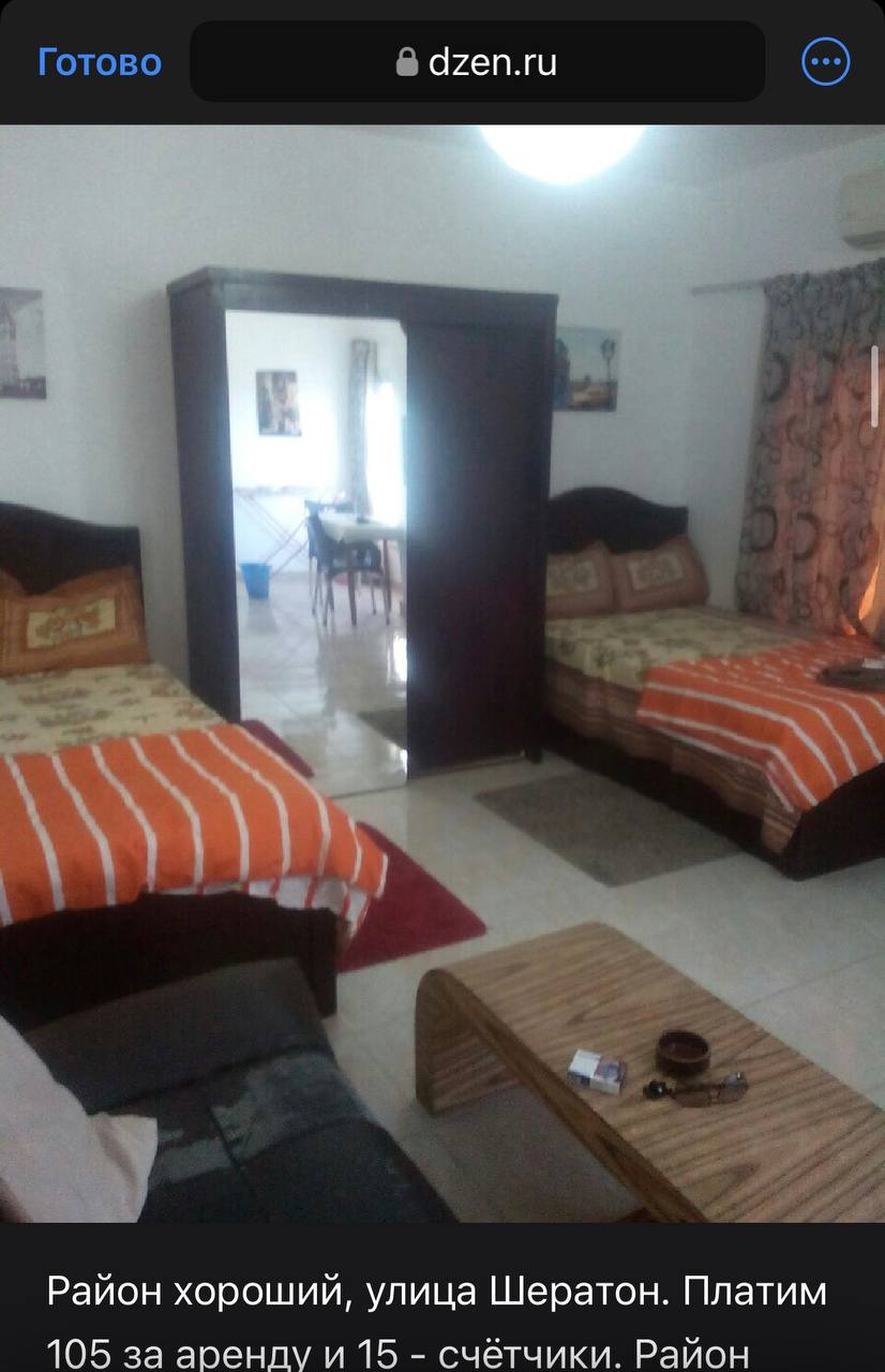 Татьяна и её спутник Игорь арендовали студию на улице Шератон, в оживлённом районе Хургады, где всё рядом: магазины, кафе и море. Квартира обошлась им в 120 долларов (9200 рублей) в месяц, включая коммунальные услуги.
