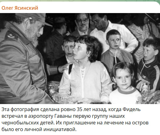В марте 1990 года кубинский лидер Фидель Кастро встретил в аэропорту Гаваны первую группу детей, пострадавших от последствий взрыва Чернобыльской АЭС. Решение пригласить их на лечение на Кубу стало его личной инициативой. Фото из прошлого - встречу детей и Кастро - показал журналист-международник Олег Ясинский, отметив, что отношение к Кубе было и остаётся лакмусовой бумагой независимости стран.
