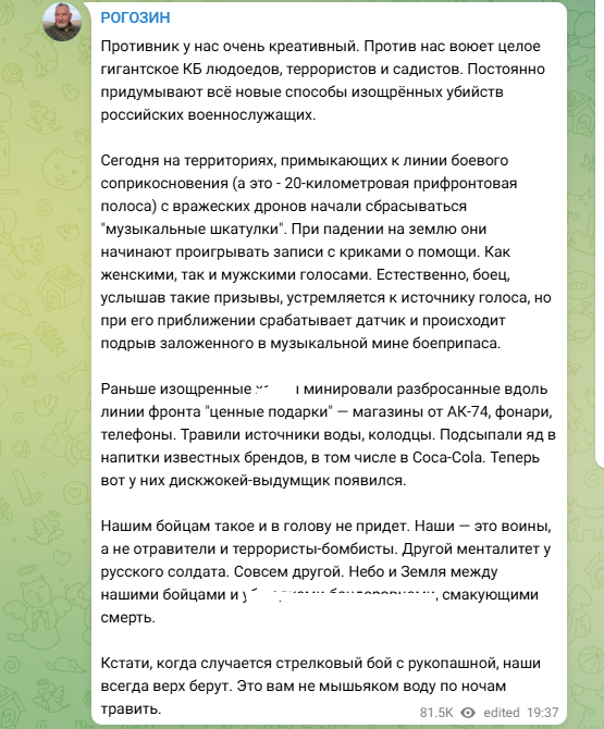 Недавно среди сюрпризов, приготовленных украинскими террористами для русских бойцов, оказались весьма необычные мины. Сделаны они в виде "музыкальных шкатулок". Мины-шкатулки при падении на землю начинают оглашать окрестности криками о помощи. Запись делается как мужскими голосами, так и женскими. Русские бойцы, конечно, услышав крики, устремляются на помощь. Однако при приближении человека срабатывает специальный датчик и происходит взрыв.