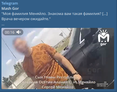 В Северной Осетии мужчина, представившийся сыном главы региона Сергея Меняйло, начал качать права в разговоре с полицейским, который остановил его с супругой на дороге. В ход пошли запрещённые приёмы с угрозами и упоминанием влиятельных родственников.