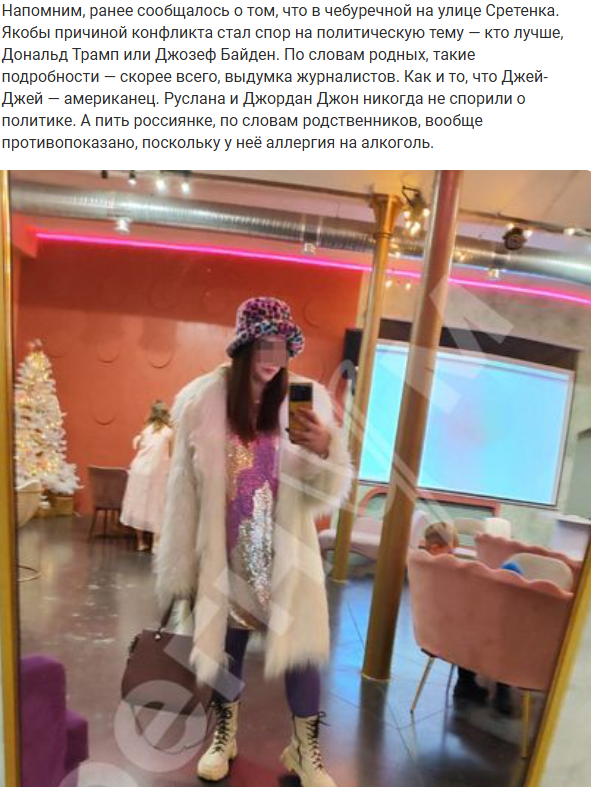 Называют выдумкой и ссору перед дебошем. Некоторые источники утверждали, что Руслана и Джон спорили, кто лучший президент для Америки - Джо Байден или Дональд Трамп, вот страсти и накалились до предела.