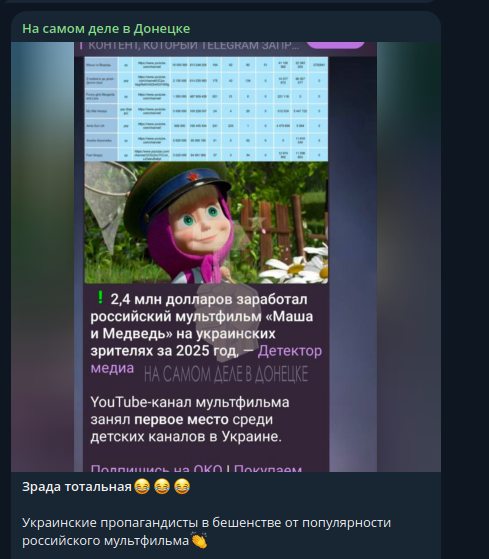 Если очень грубо сосчитать и учитывать то, что дети мультфильмы смотрят долго, что даёт глубину просмотра, то средний RPM "Маши и Медведя" может быть 3 доллара. Таким образом, только за 2025 год россияне, вероятно, заработали на украинских зрителях более 2,4 миллиона долларов.