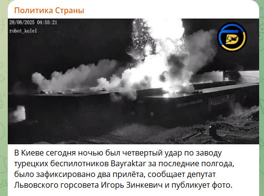 Удары по заводу Bayraktar признают и украинские ресурсы. В Киеве сегодня ночью был четвёртый удар по заводу турецких беспилотников Bayraktar за последние полгода, было зафиксировано два прилёта, пишет "Политика страны" со ссылкой на депутата Львовского горсовета Игоря Зинкевича, который опубликовал фото.