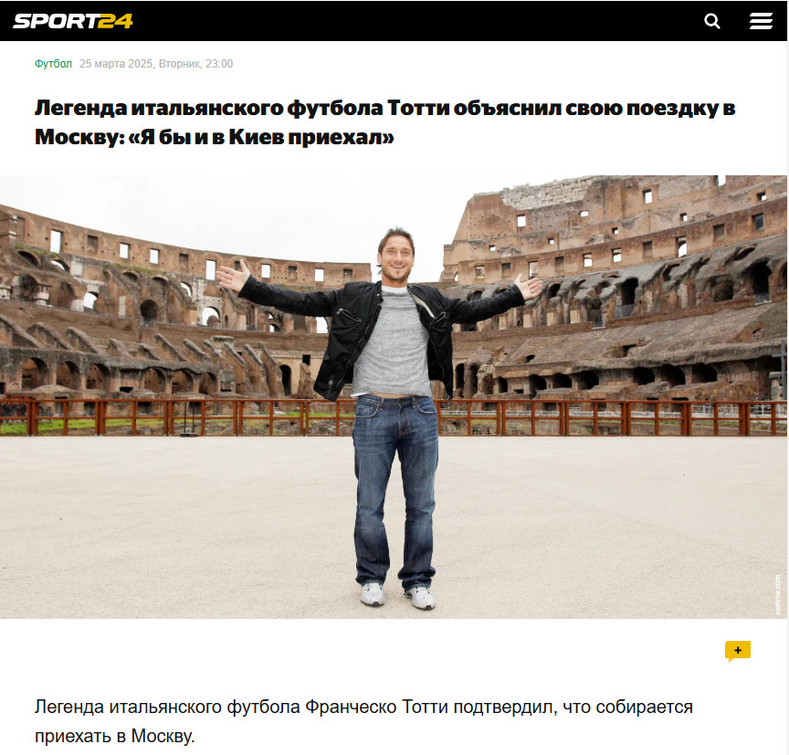 Легенда итальянского футбола Франческо Тотти подтвердил, что собирается приехать в Москву. Ранее организаторы одной из букмекерских контор анонсировали участие Тотти в мероприятии в качестве специального гостя 8 апреля. С 11 марта на медиафасадах Москвы демонстрировали видеоролик с изображением футболиста и надписью: "Император едет в Третий Рим".