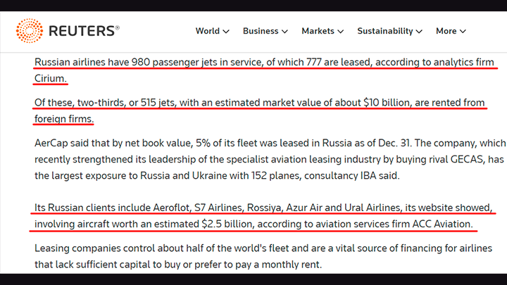 Данные по числу самолётов в авиапарке России на момент начала СВО и сведения о лизинговых бортах, скриншот страницы сайта reuters.com