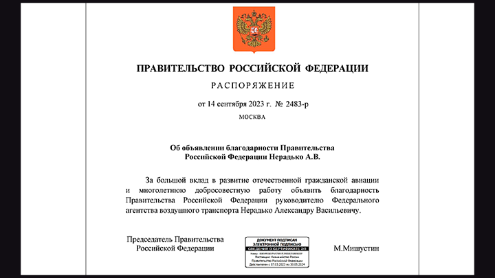 Постановление об объявлении благодарности главе Росавиации Александру Нерадько, скриншот страницы сайта publication.pravo.gov.ru