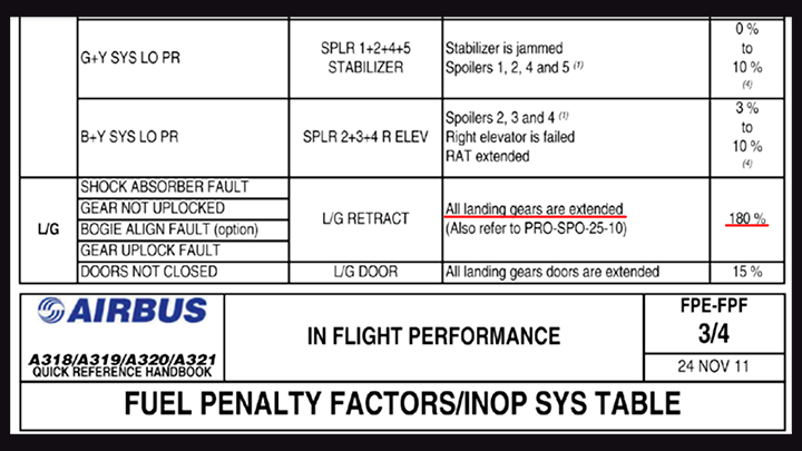 Фрагмент таблицы о повышении расхода топлива лайнерами A320/321, выделено значение при полном выпуске всех стоек шасси, скриншот страницы сайта safetyfirst.airbus.com