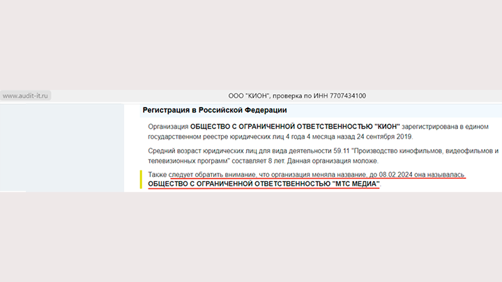ООО "Кион" до 8 февраля текущего, то есть 2024 года называлась ООО "МТС-Медиа" – именно под таким юридическим наименованием был зарегистрирован осенью 2019-го онлайн-кинотеатр, в создании которого принимал непосредственное участие Игорь Мишин.