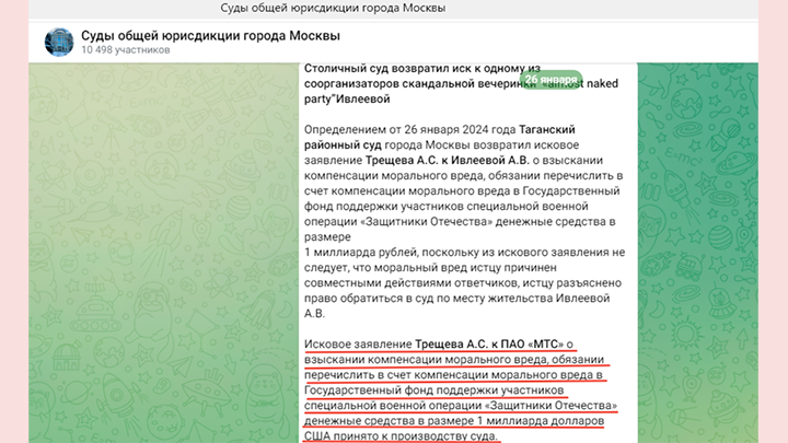 При этом, несмотря на то что Таганский суд Москвы трижды отказал в коллективном иске общественников к самой Ивлеевой (о компенсации морального вреда вследствие голой вечеринки и обязании перечислить 1 млрд рублей в Государственный фонд поддержки участников СВО), однако же принял исковое заявление к ПАО "МТС", выдвинутое всё по тем же самым основаниям, что и к Ивлеевой. Только сумма перечисления в фонд участников СВО увеличена в нём до 1 миллиарда долларов (не рублей!).