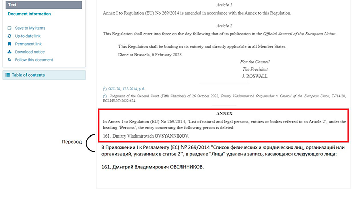 Запись в официальном журнале ЕС о снятии санкций с бывшего губернатора Севастополя / Скриншот с сайта eur-lex.europa.eu