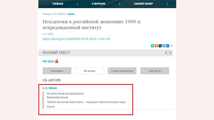 Статья иностранца Чубайса о неплатежах в российской экономике / Скриншот с сайта vopreco.ru