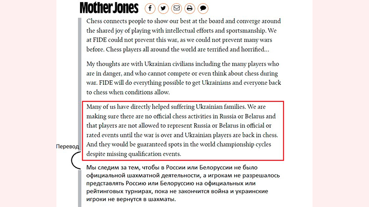 Мы следим за тем, чтобы в России или Белоруссии не было официальной шахматной деятельности, а игрокам не разрешалось представлять Россию или Белоруссию на официальных или рейтинговых турнирах, пока не закончится война и украинские игроки не вернутся в шахматы.