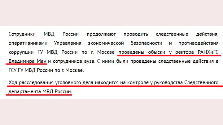 Скриншот с официального сайта ГУ МВД по городу Москве о проведении обыска у Владимира Мау