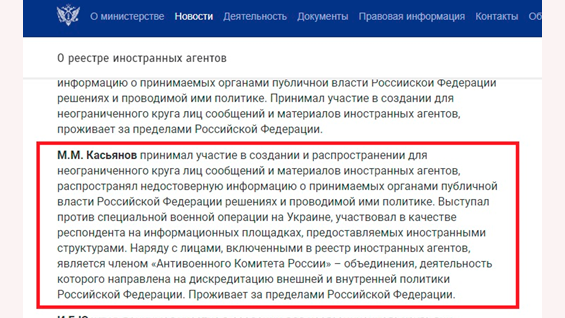 Касьянов* в реестре иноагентов / Скриншот с сайта minjust.gov.ru