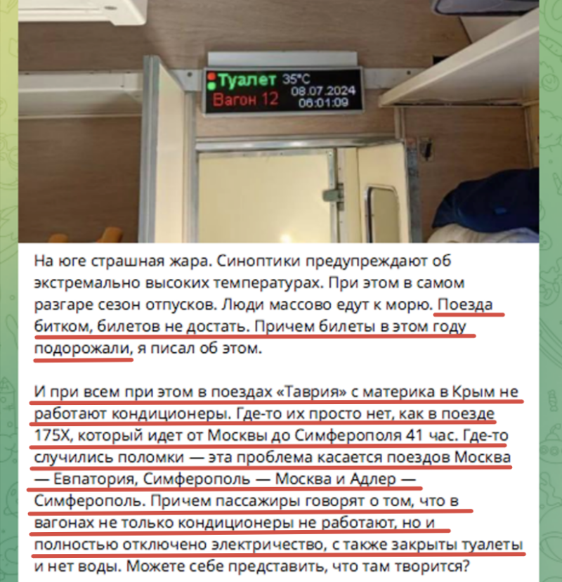 На юге страшная жара. Синоптики предупреждают об экстремально высоких температурах. При этом в самом разгаре сезон отпусков. Люди массово едут к морю. Поезда битком… И при всём при этом в поездах "Таврия" с материка в Крым не работают кондиционеры. Где-то их просто нет, как в поезде 175Х, который идёт от Москвы до Симферополя 41 час. Где-то случились поломки — эта проблема касается поездов Москва — Евпатория, Симферополь — Москва и Адлер — Симферополь. Причём пассажиры говорят о том, что в вагонах не только кондиционеры не работают, но и полностью отключено электричество, а также закрыты туалеты и нет воды. Можете себе представить, что там творится?