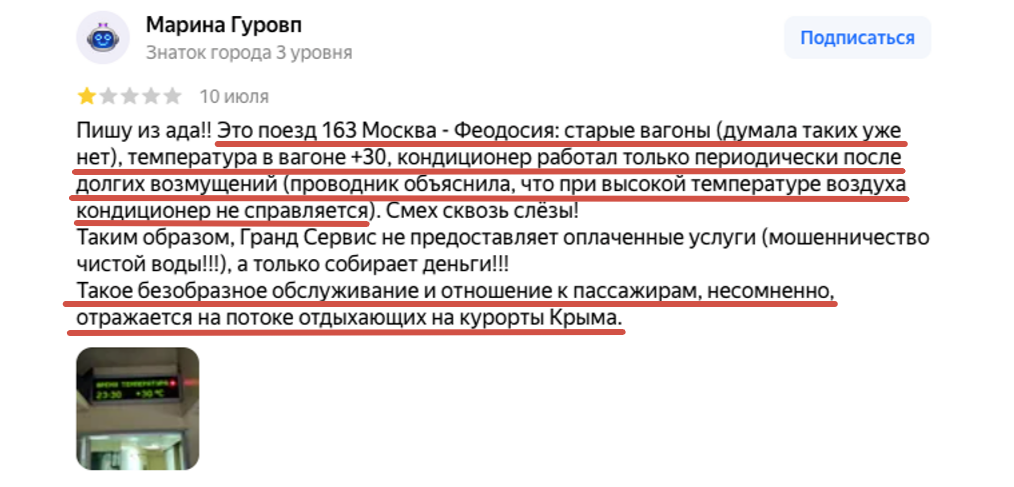 Пишу из ада! Это поезд 163 Москва — Феодосия: старые вагоны (думала, таких уже нет), температура в вагоне +30, кондиционер работал только периодически после долгих возмущений (проводник объяснила, что при высокой температуре воздуха кондиционер не справляется)… Такое безобразное обслуживание и отношение к пассажирам, несомненно, отражается на потоке отдыхающих на курорты Крыма,