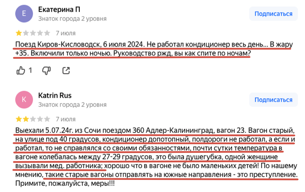 Кто-то описывает свой испорченный отдых в отзывах к штаб-квартире ОАО "РЖД" на "Яндекс. Картах". Ниже — размещённые рядом две жалобы от 7 июля: