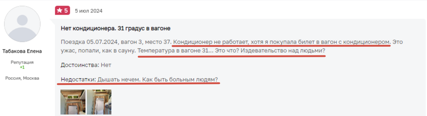 * Поездка 05.07.2024, вагон 3, место 37. Кондиционер не работает, хотя я покупала билет в вагон с кондиционером. Это ужас, попали как в сауну. Температура в вагоне 31... Это что? Издевательство над людьми? Дышать нечем. Как быть больным людям?