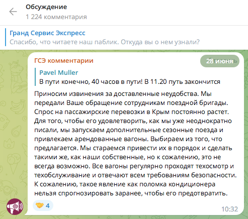Свою позицию представители "Гранд Сервис Экспресса" озвучили ещё в комментариях к посту в своём Telegram-канале, где 27 июня валом пошли жалобы от пассажиров на неработающие кондиционеры:
