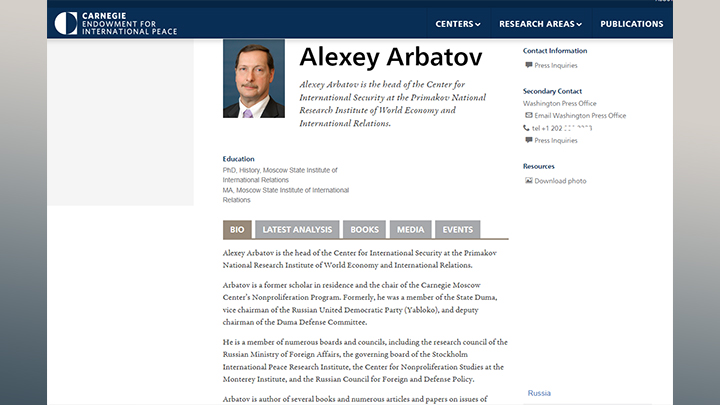 Профиль и биография Арбатова на сайте Центра Карнеги** в США. Он указан там как "бывший руководитель Программы нераспространения Московского центра Карнеги**"//Скриншот страницы сайта Центра Карнеги** из веб-архива