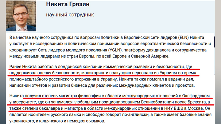 В исполнительный комитет YGLN, а также в попечительский совет ELN входит выпускник Высшей школы экономики в Москве — некий Никита Грязин. После окончания ВШЭ этот персонаж длительное время работал в неназванной частной британской разведывательной компании, которая среди прочего занималась эвакуацией британского дипперсонала, а вероятнее всего — сотрудников МI6, с Украины после начала СВО.
