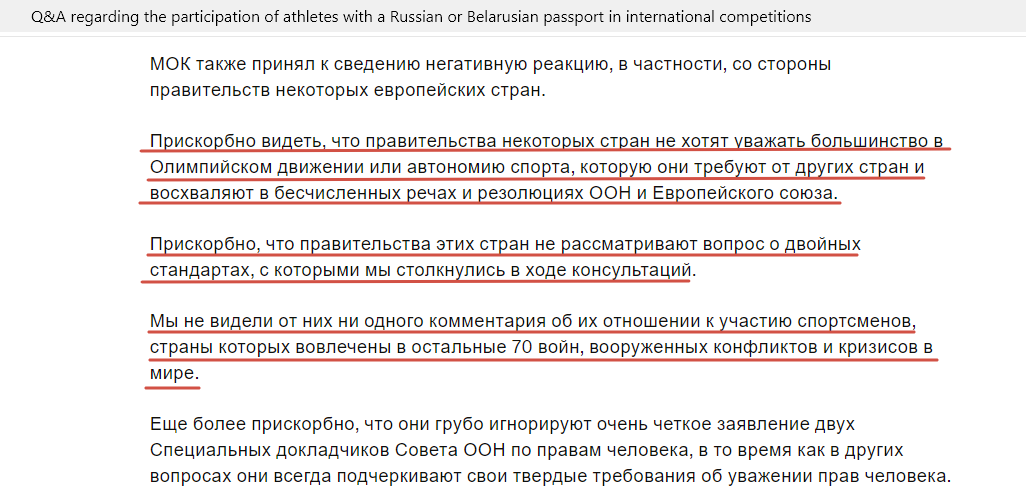 Прискорбно видеть, что некоторые государства не хотят уважать большинство в олимпийском движении и автономию спорта. Прискорбно, что такие государства не поднимают вопрос о двойных стандартах, с которыми мы столкнулись во время наших консультаций. Мы не видели от них ни одного комментария относительно их взглядов на участие спортсменов, чьи страны вовлечены в другие 70 войн и конфликтов, которые продолжаются в мире, но ещё более прискорбно, что они грубо пренебрегают очень чётким мнением спецпредставителей Совета ООН по правам человека.
