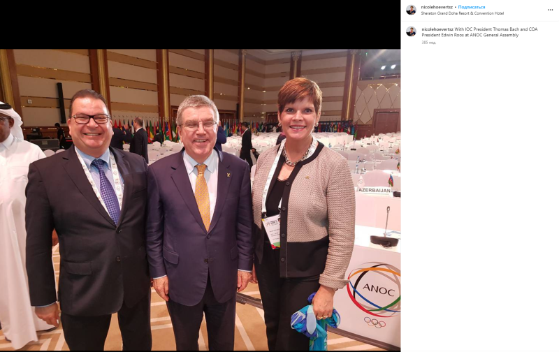 Президент Олимпийского комитета Арубы Эдвин Роос, глава МОК Томас Бах и главная охотница за русскими спортсменами Николь Хевертц//Скриншот с личной страницы Николь Хевертц в соцсети