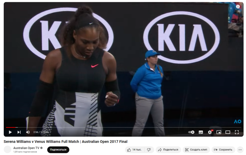 Серена Уильямс на чемпионате Австралии//Скриншот страницы ютуб-канала Australian Open TV
