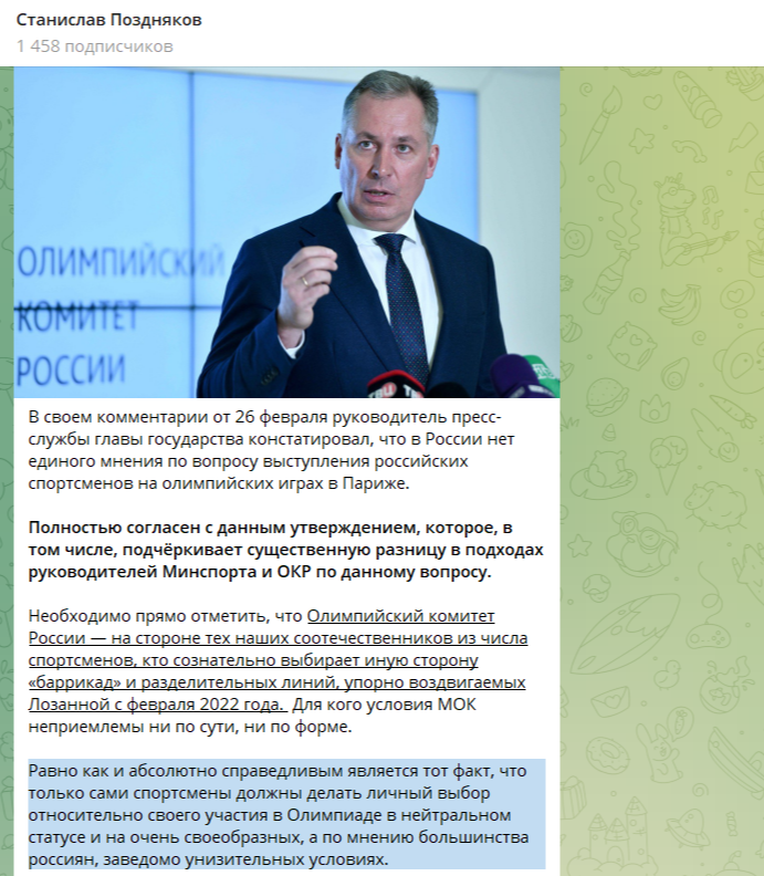 Поздняков согласен с теми, кто считает условия МОК унизительными//Скриншот поста из ТГ-канала главы ОКР