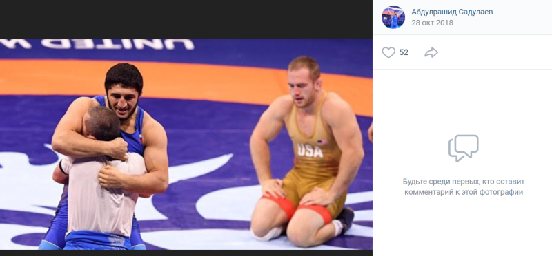 "Русский танк" Абдулрашид Садулаев после победы над американцем Кайлом Снайдером в 2018 году//Скриншот поста на странице Садулаева в ВК