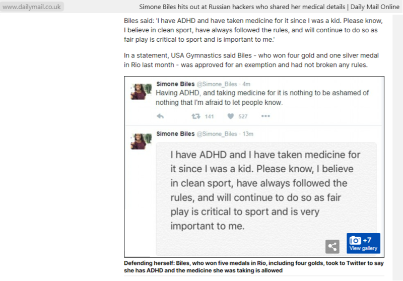 В США спортсмены предпочитают иные заболевания. В особенном почёте психосоматические расстройства, такие как синдром дефицита внимания (СДВГ). Обычно СДВГ встречается у детей и с возрастом проходит сам, но не у американских атлетов. Он диагностирован сразу у трёх олимпийских чемпионов из США — гимнастки Симоны Байлз, метательницы ядра Мишель Картер и знаменитого пловца Майкла Флепса.