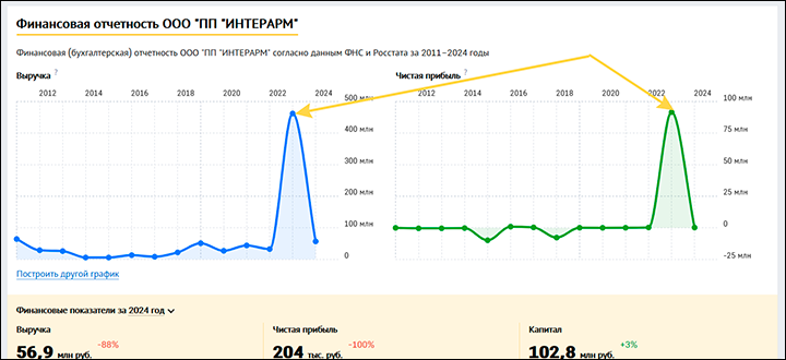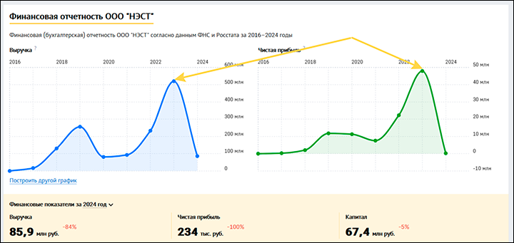 Вот они – пиковые моменты в финансовой отчётности субподрядчика, когда, судя по всему, и исполнялся контракт. Скриншот страницы сайта checko.ru