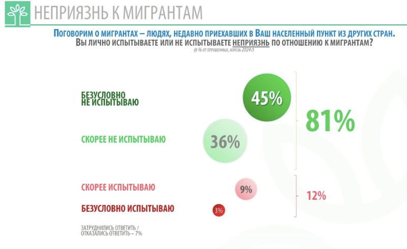 Мы видим отсутствие неприязни к мигрантам: 81% заявили о том, что не испытывают негативных эмоций к тем, кто приехал в их населённый пункт из других стран. Это очень высокий показатель. Только 12% заявили о том, что они испытывают негативные эмоции,