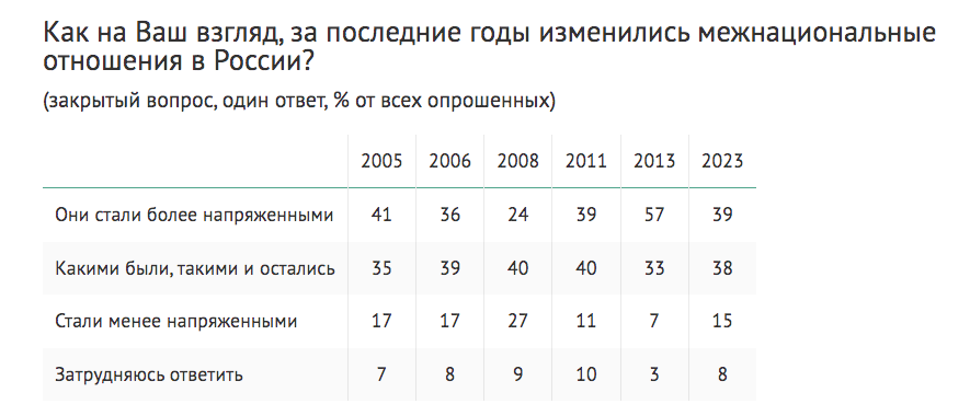 В опубликованном ВЦИОМ 14 августа прошлого года опросе подвёрстаны данные из аналогичных исследований 2005-го, 2006-го, 2008-го, 2011-го и 2013-го годов, из которых следует, что оценка межнациональной ситуации в целом остаётся постоянной на протяжении двух десятилетий – проценты в ответах на вопрос колеблются в пределах статистической погрешности, обычно составляющей около 2,5%. Стабильно около 40% с редкими колебаниями в 2008-м и 2013-м годах опрошенных говорили, что за прошедшие годы межнациональные отношения в России стали более напряжёнными, а как ставшие менее напряжёнными их оценивали 15-17%.