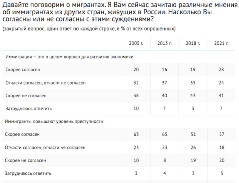 Из года в год, из десятилетия в десятилетие, по опросам ВЦИОМ стабильно около 40% респондентов высказывались, что межнациональные отношения в России становятся всё более напряжёнными, около 40% однозначно считали иностранную иммиграцию отрицательным явлением для экономики и около 60% – источником преступности. И это без достаточно большого процента тех, кто был "отчасти согласен, отчасти несогласен".