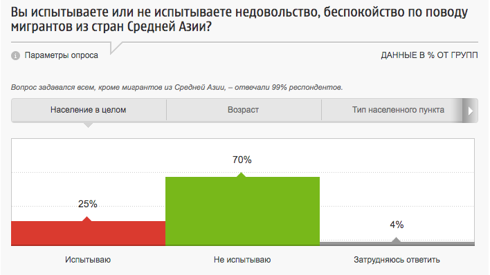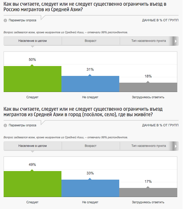 В ответах на вопрос "По Вашему мнению, въезд в Россию представителей каких стран является НЕжелательным?", антилидерами тогда оказались приезжие из Таджикистана (15%) и Узбекистана (14%). При этом в ответах на вопрос "По Вашему мнению, въезд в Россию представителей каких стран является желательным?", в лидерах оказались Белоруссия (25%) и Украина (21%), а за приезд в Россию выходцев из Таджикистана и Узбекистана высказались, соответственно, лишь 4% и 8%.