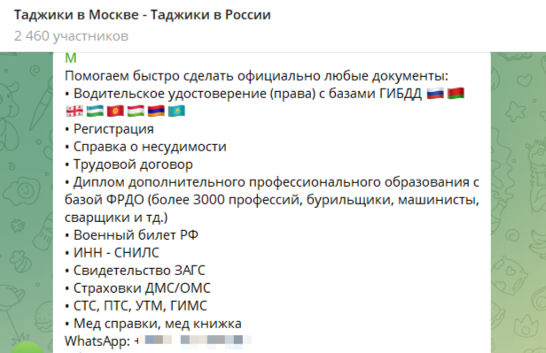 Ресурсов, предлагающих мигрантам "официально и законно" оформить документы для проживания и работы в нашей стране, – полным-полно//Скриншот из ТГ-канала "Таджики в Москве"