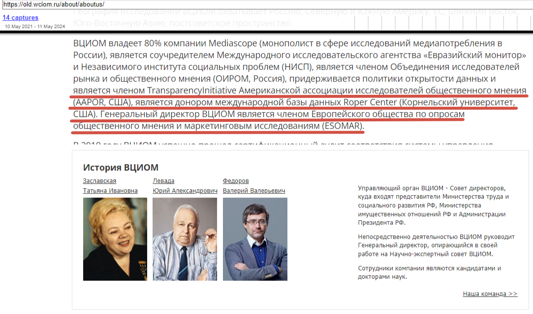 Эта информация была доступна как минимум до октября 2022 года – к тому времени СВО длилась уже почти восемь месяцев. На современной версии сайта её уже нет. Однако официальных сообщений о выходе ВЦИОМ из упомянутых организаций мы не нашли.