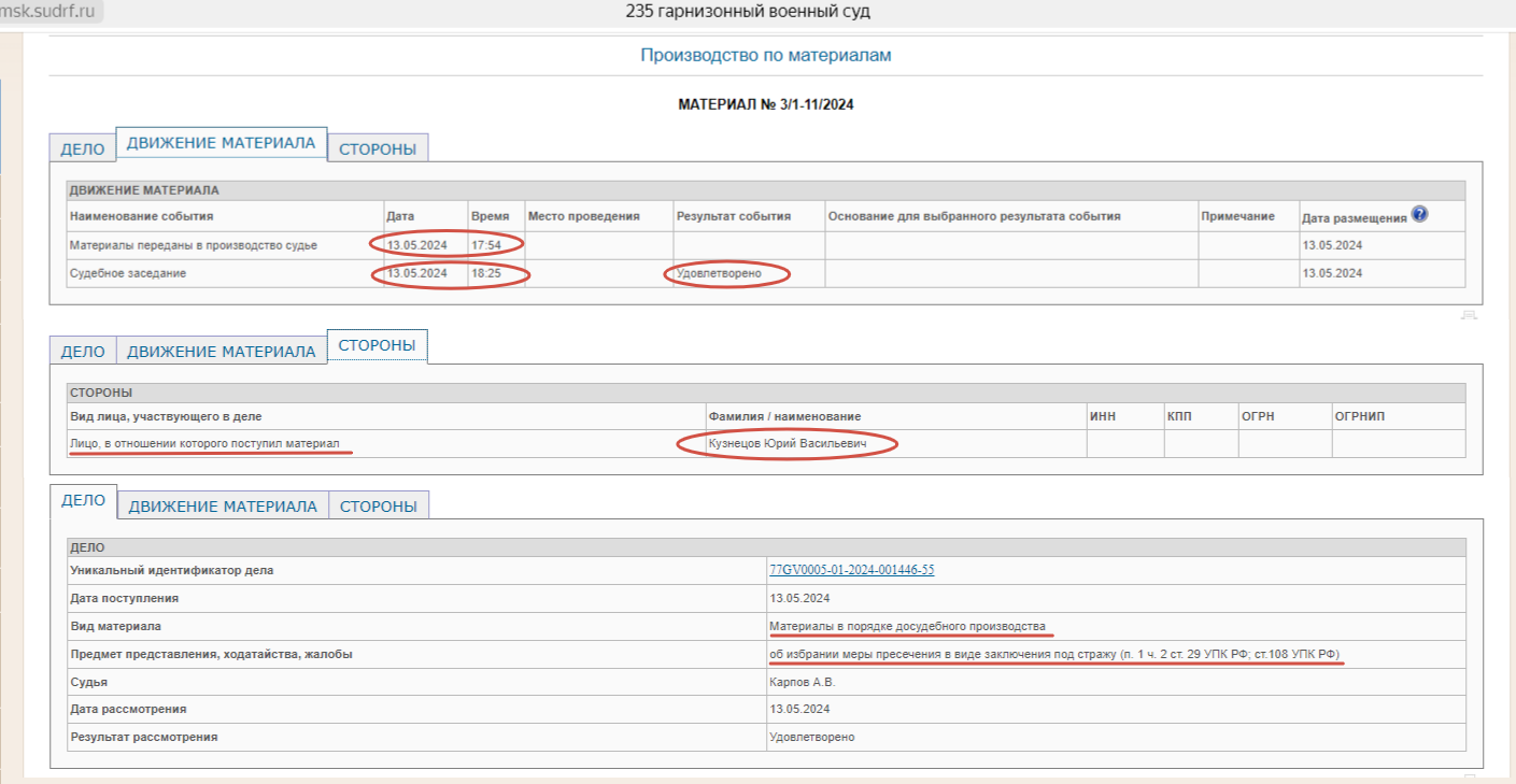 Кстати, что интересно: само сообщение о рассмотрении материалов дела появилось на сайте 235-го гарнизонного суда с указанием ФИО генерала ещё поздно вечером в понедельник, 13 мая, а вот строчка об удовлетворении ходатайства – уже после официального сообщение СКР. Но это уже детали.